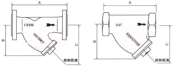 | 口徑(in) | ANSI法蘭連接 | 螺紋連接 | B | C | 濾網(wǎng)面積cm2 | ||